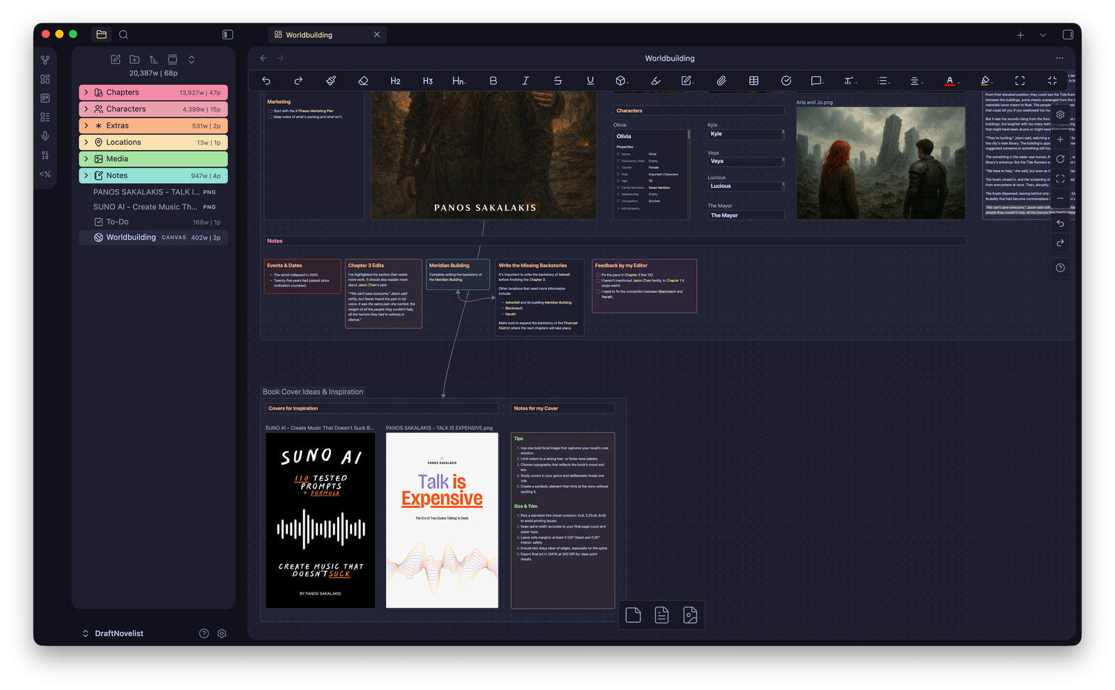 A pre-built Canvas acts as the control center of your novel — characters, locations, chapters, notes, to-do list, and book details all linked together as a visual map.
